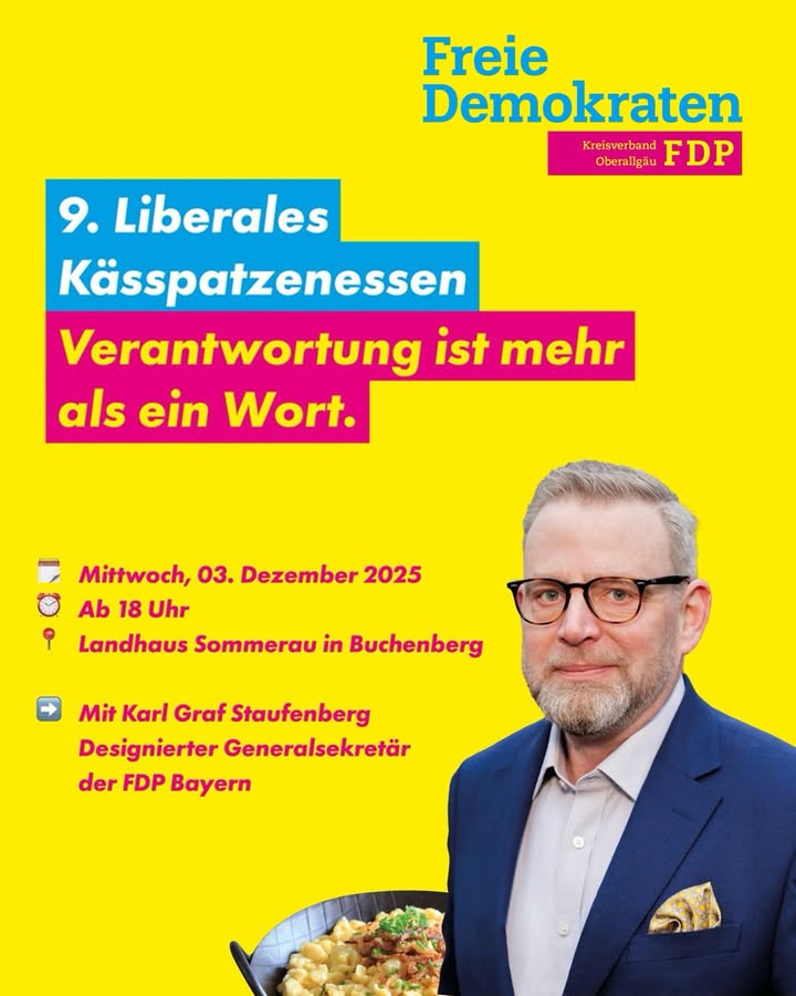 Herzliche Einladung zum 9. traditionellen Kässpatzenessen der FDP Oberallgäu! Ein Abend voller Austausch, Genuss und starken Impulsen aus der bayerischen Landespolitik. Mit dabei: @karlgrafstauffenberg, designierter Generalsekretär der @fdpbayern. Er spricht über die Bedeutung des ländlichen Raums – und darüber, warum Verantwortung für uns Freie Demokraten mehr ist als ein Wort. Dazu gibt’s natürlich Kässpatzen aufs Haus 🧀✨ Und wir präsentieren unsere Liste für die Kreistagswahl 2026. 🗓 Mittwoch, 3. Dezember 2025 ⏰ ab 18 Uhr 📍 Landhaus Sommerau, Buchenberg Wir freuen uns auf euch! 🫶🏼