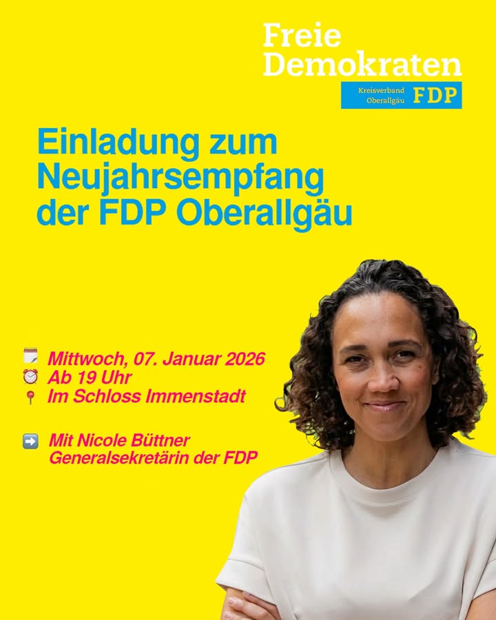Wir laden euch herzlich zu unserem Neujahrsempfang ein. 🥂✨ Gemeinsam mit unserem Ehrengast @nicole__buettner, Bundesgeneralsekretärin der @fdp, blicken wir auf die kommenden politischen Herausforderungen. 🗣️💛 Freut euch auf einen spannenden Abend und persönlichen Austausch in festlichem Rahmen: 📅 Mittwoch, 07.01.2026 ⏰ 19:00 Uhr 📍 Schloss Immenstadt (Marienplatz 1, 87509 Immenstadt) Wir freuen uns darauf, mit euch gemeinsam in ein starkes Jahr zu starten! 👋🏰 #FDPOberallgäu #Neujahrsempfang #FDP #Immenstadt #NicoleBüttner Politik Oberallgäu FreieDemokraten