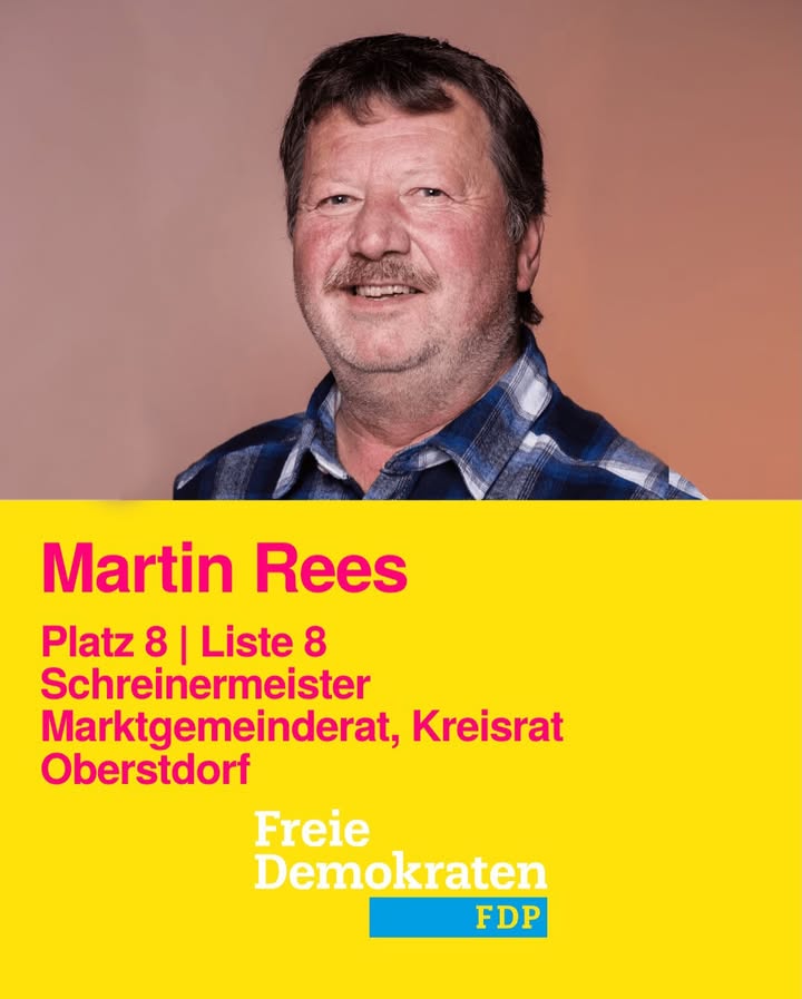 Unser Martin Rees ist auf Platz 8 bei der Kreistagswahl 💛 Er ist selbstständiger Schreinermeister aus Oberstdorf und dort seit 24 Jahren im Marktgemeinderat aktiv. Außerdem ist er einer unserer aktuellen FDP-Kreisräte im Oberallgäu. 🏛️ Bei der Kreistagswahl tritt er an für ein starkes Handwerk, ein lebendiges Vereinsleben und ein Ehrenamt, das den Rückenwind bekommt, den es verdient. 🔨🤝 Kluge Politik fürs Oberallgäu. #MachenWirEsMöglich Am 08.03 #FDP wählen 🗳️
